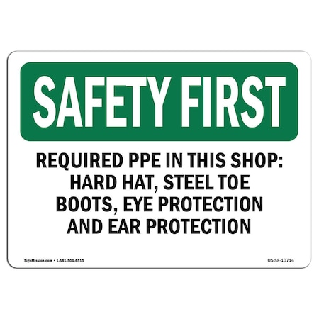 OSHA Sign, Required PPE In This Shop Hard Hat Steel, 24in X 18in Decal, 24" W, 18" H, Landscape
