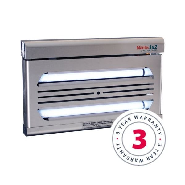 Professional fly light trap attracts and eliminates flying insects, ideal for use in commercial kitchens and food prep areas.the mantis professional ilt comes manufactured with highest grade shatter resistant lamps for extra protection in glass-free zones. Standard stainless steel lamps are available as an option. Portable (with optional stand) and ideal for use in food preparation areas and a variety of other sensitive areas. Attractive, ultra-slim, compact and unobtrusive wall-mounted system. 2" in depth: ideal for areas where space is limited 2x15w 18" t8 (1") quantum lamps: 180 coverage and optimum performance fda compliant fep shatter resistant coating: protection in glass-free zones patented reflectobakt sleeve: extending glue board life easy to remove bottom tray, drop-down guard and front cover for quick and easy no tool service available in 110v and 220v 3 year waranty. Silent capture. T8 lead free shatter resistant quantum lamps. High performance, commercial grade insect light trap for years of 24/7 reliable flying insect management. Tubes/lamps replaced annually. Energy efficient features: ultra slim design ul listed protecting brand equity and reputations includes a full size (148 sq inch) black glue board easily covers a 40' x 40' size room replacement parts lamps: standard: tub15w430/130-000160 shatter resistant: tub15w490/130-000171 glueboards: original: boacha850/135-000047 (black) universal: boaman853/135-000070 (black) boamanwt/135-000064 (white) matrix: boaman867/135-000063 (gray) plastic: boaman872/135-000048 (black)