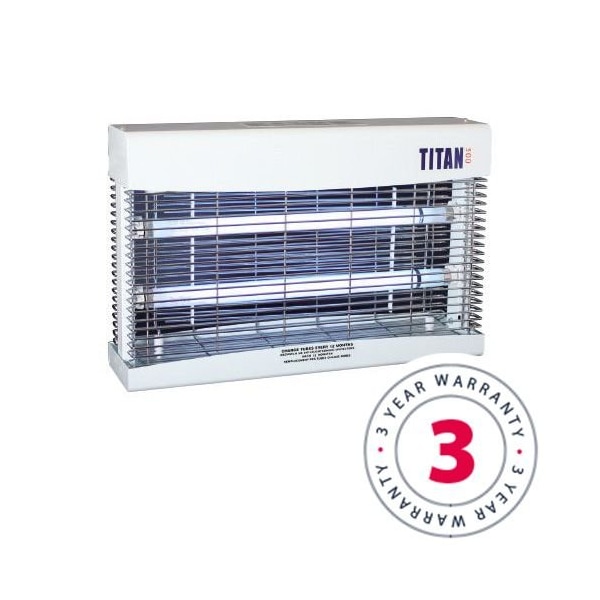360 degree coverage for optimum performance with the titan double sided ceiling suspended electrocutor. 3 year waranty. Electrocutor. T8 lead free, shatter resistant quantum lamps. High performance, commercial grade insect light trap for years of 24/7 reliable flying insect management. Tubes/lamps replaced annually.2 x 15w quantum lamps provide 360 coverage for optimum performancethe lamps feature an fda compliant fep shatter resistant coating which provides protection from contamination in glass-free zonespowder coated white steel allows this durable unit years of low maintenance serviceideal for providing fly control in non-food prep areas of kitchens, shops, warehouse etc