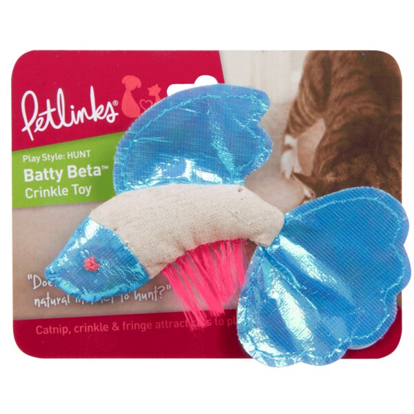 Petlinks Batty Beta Fish with Frills Catnip Cat Toy has multiple textures and bright colors to attract cats. Crinkle, fringe and catnip will all attract and stimulate play time. Great size to bat, pounce and carry. Loaded with pure and potent catnip. Our catnip is always produced without chemicals or pesticides, grown on our own catnip farms! Most cats respond to catnip with a burst of energetic activity followed by a purrfectly calm mellow period Petlinks products enhance the way that people and pets live and play together. The innovations behind our thoughtful, fun and effective products are driven by consumer insights, extensive research and thorough testing. Incorporating environmentally friendly, sustainable materials whenever possible, our products are designed to child safety standards and are backed by our 100% satisfaction guarantee, so pet parents can rest easy with Petlinks products! Read all packaging instructions, warnings and cautions upon receipt. Packaging contains small parts, discard after opening.