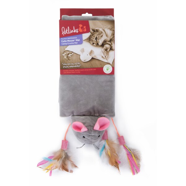 Petlinks Cutie Mouse Mat is a unique solution for cats combining a play mat, plush comfort, with pure and potent catnip, feathers, a mouse toy. Mat has crinkle sound and a mouse toy attached. Feathers and raffia are attached at each corner with pure and potent catnip. Most cats respond to catnip with a burst of energetic activity followed by a purrfectly calm mellow period. Our catnip is produced without chemicals or pesticides on our own catnip farms. This mat satisfies your cats need for independent play and comforting plush material invites cats to play and relax. Available in Gray or Cream, color will be randomly selected. Petlinks products enhance the way that people and pets live and play together. The innovations behind our thoughtful, fun and effective products are driven by consumer insights, extensive research and thorough testing. Incorporating environmentally friendly, sustainable materials whenever possible, our products are designed to child safety standards and are backed by our 100% satisfaction guarantee, so pet parents can rest easy with Petlinks products! Read all packaging instructions, warnings and cautions upon receipt. Packaging contains small parts, discard after opening.