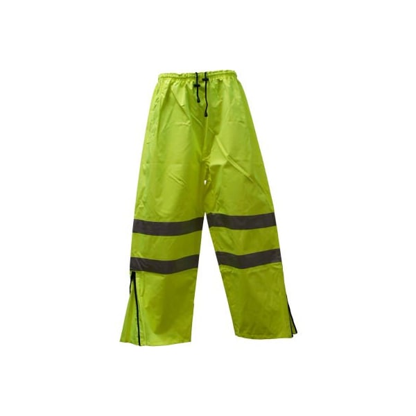 features: polyester oxford with waterproof 300d pu coating meets ansi class e standards with 2" wide reflective stripes adjustable zippers on ankles for safety & comfort available sizes: s-5xl two pass-through slits for front pocket access elastic & draw string on waist two tone lime/black design to keep the dirt less visible