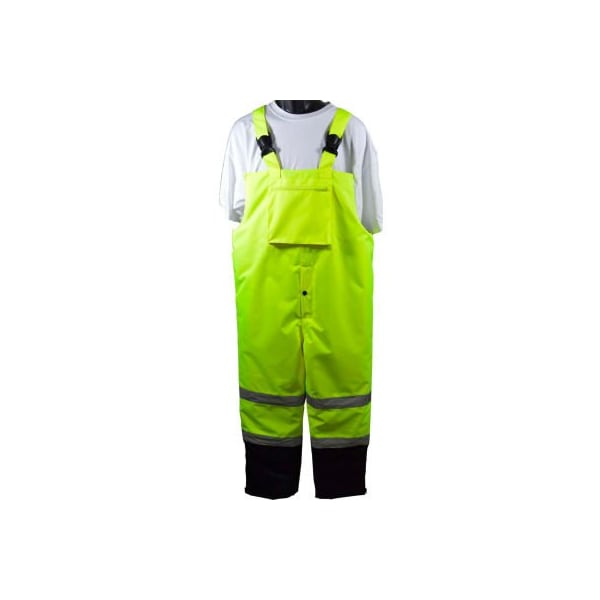 Petra roc waterproof quilted thermal bib rain pants, ansi/isea class e, lime/black, m, lqbbip-ce-m features: polyester 300d oxford with waterproof pu coating sewn in quilted thermal liner meets ansi class e standard with 2" wide reflective stripes adjustable elastic suspenders with quick release buckles. Single snap fly. adjustable zippers on ankles for safety & comfort black bottom design to reduce the staining one zipped cargo pocket on the bib for storage. available sizes: s-5x