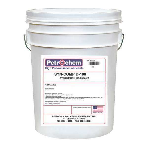 Compressor Oil, Container Size 5 gal, Container Type Pail, SAE Grade 30, ISO Viscosity Grade 100, Viscosity Index 94, Flash Point 495 Degrees F, Food Grade No, Series Syncomp D-100, Application Air-Oilers, Air-Tools, And Are Compatible In Ammonia Refrigerant Systems, Bearings, Cables, Compressors, Drip Oilers, Gear Head Motors, Multistage Reciprocating Compressors, Roller Chains, Stationary Rotary Vane And Screw Compressors, Water Pumps, Viscosity @ 40C 97 cSt, Viscosity @ 100C 10.8 cSt
