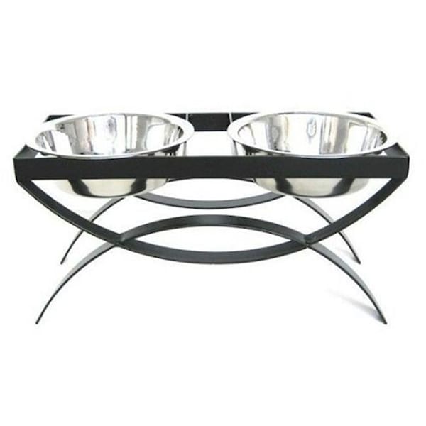 The See Saw Dog Feeder features a sleek and unobtrusive design, yet provides a stable platform for your dog to enjoy his meals comfortably. Our newest diner featuring a sturdy, beautiful design constructed from heavy duty flat iron and non-skid plastic tips on the legs. This elevated dog bowl allows your dog to dine in an upright position thereby improving digestion. Two bowl brackets ensure that the two bowls remain firmly in place. The stainless steel bowls are easily detachable and dishwasher safe. Ideal for design-conscious pet owners.