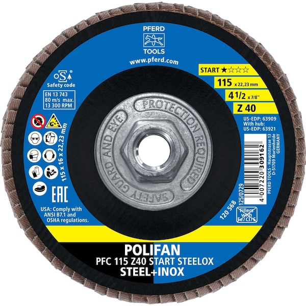 The START range from PFERD TOOLS delivers reliable quality designed specifically for trade and assembly work. This compact product line includes all the essential tools for processing steel and stainless steel INOX, allowing users to achieve consistent results at an attractive purchase cost. The POLIFAN flap disc in this range offers a good stock removal rate and solid tool life, making it an efficient and economical choice for general-purpose grinding and finishing applications on metal surfaces.
