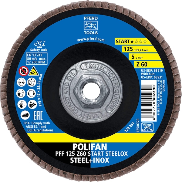 The START range from PFERD TOOLS delivers reliable quality designed specifically for trade and assembly work. This compact product line includes all the essential tools for processing steel and stainless steel INOX, allowing users to achieve consistent results at an attractive purchase cost. The POLIFAN flap disc in this range offers a good stock removal rate and solid tool life, making it an efficient and economical choice for general-purpose grinding and finishing applications on metal surfaces.