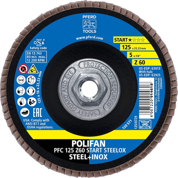 The START range from PFERD TOOLS delivers reliable quality designed specifically for trade and assembly work. This compact product line includes all the essential tools for processing steel and stainless steel INOX, allowing users to achieve consistent results at an attractive purchase cost. The POLIFAN flap disc in this range offers a good stock removal rate and solid tool life, making it an efficient and economical choice for general-purpose grinding and finishing applications on metal surfaces.