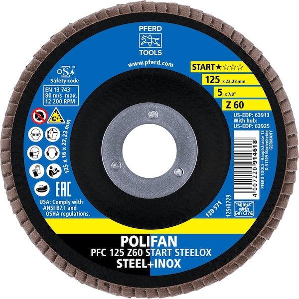 The START range from PFERD TOOLS delivers reliable quality designed specifically for trade and assembly work. This compact product line includes all the essential tools for processing steel and stainless steel INOX, allowing users to achieve consistent results at an attractive purchase cost. The POLIFAN flap disc in this range offers a good stock removal rate and solid tool life, making it an efficient and economical choice for general-purpose grinding and finishing applications on metal surfaces.