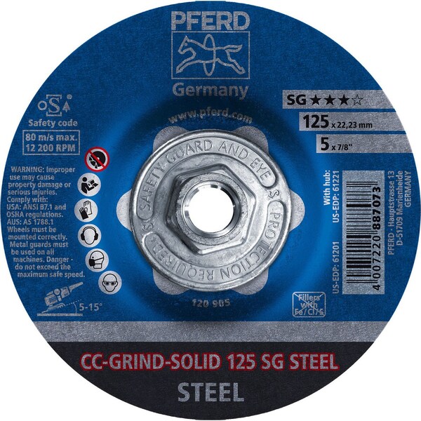 PFERD 61221 5in CC-GRIND-SOLID 5/8-11 Thread - SG for STEELPFERD tools for grinding and cutting are of premium quality. Decades of experience in advising on diverse applications lead us to the continuous development of new and innovative products.With the CC-GRIND-SOLID, PFERD offers a modern, high-performance and ergonomic alternative to conventional grinding wheels.Materials that can be worked: Steel Applications: ChamferingWork on edgesDeburringSurface grindingSurface workWeld dressingFine grinding in multiple stepsDrive types: Angle grinder Specifications: Diameter5Bore5/8-11Max. RPM12200 RPMPacking unit10 pcs.EDP number61221
