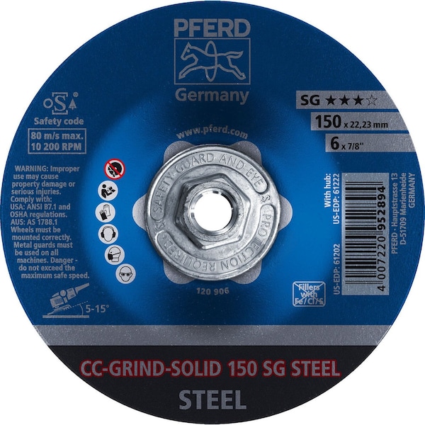 PFERD 61222 6in CC-GRIND-SOLID 5/8-11 Thd. - SG for STEELPFERD tools for grinding and cutting are of premium quality. Decades of experience in advising on diverse applications lead us to the continuous development of new and innovative products.With the CC-GRIND1/4-SOLID, PFERD offers a modern, high-performance and ergonomic alternative to conventional grinding wheels.Materials that can be worked: Steel Applications: ChamferingWork on edgesDeburringSurface grindingSurface workWeld dressingFine grinding in multiple stepsDrive types: Angle grinder Specifications: Diameter6Bore5/8-11Max. RPM10200 RPMPacking unit10 pcs.EDP number61222