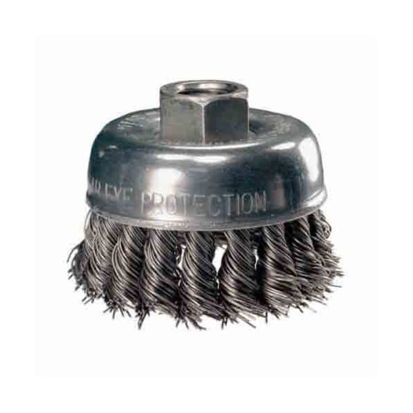 Pferd cup brush external nut heavy duty minigrinder single row, 2-3/4 in brush dia, 5/8-11 arbor hole size, standard/Twist knot Filament/wire type, 0.02 in Filament/wire dia, carbon steel fill, 7/8 in trim length, 14,000 rpm maximum.