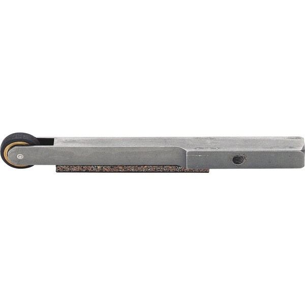 The belt grinder attachment can be pivoted on the corresponding drive system or handpiece, allowing flexible adaptation to each individual work situation. Short belt grinder attachment arm with pad for stabilization/support and with roller size 0.15" x 0.63 for belts with a belt length of 12" and a belt width of 1/8", 1/4", or 3/8".