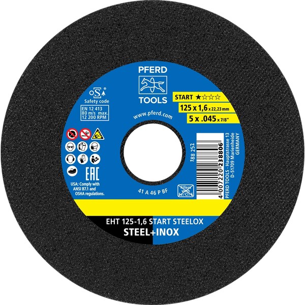 The START range from PFERD TOOLS offers reliable quality for trade and assembly work at an attractive price point. This compact line includes all the essential tools for working with steel and stainless steel INOX, delivering consistent performance and dependable results. Designed for cutting steel and stainless materials, the cut-off wheel offers good cutting performance and a long service life. PFERDs extensive range of thin cut-off wheels is available in various designs to provide the right tool solution for nearly any application-engineered for efficiency, ergonomics, and maximum user safety. These wheels are defined by their advanced bond formulation, developed through intensive research and produced in state-of-the-art facilities. The result is a high-quality, high-safety product that meets the demands of professionals worldwide.