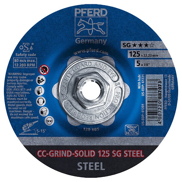 Depressed Center Grinding Wheel, Abrasive Material Ceramic, Connector Size 5/8 In.-11, Connector Type Threaded Hole, Grit 24, Overall Diameter 5 in, Overall Thickness 0.125 in, Primary Material Application Steel, Compatible Tool Type Angle Grinder, Series CC-Grind, Wheel Type Type 27, Maximum Operating Speed 12,200 RPM, Grade Extra Coarse