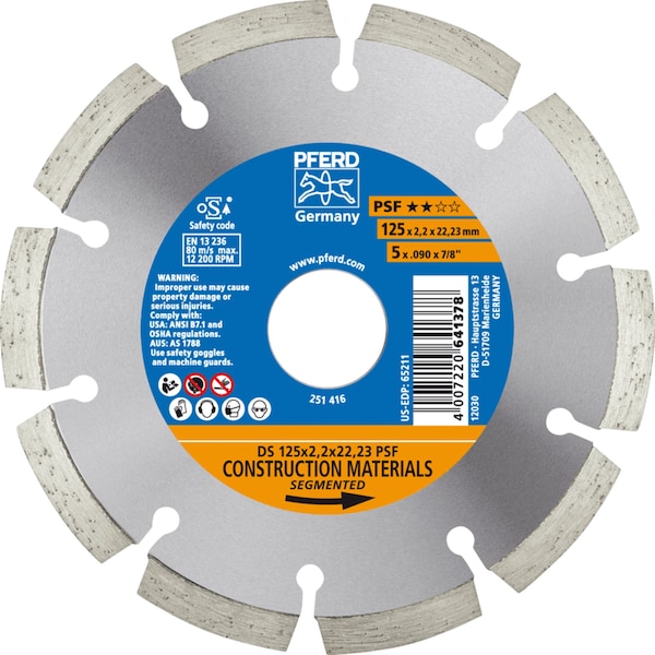 PFERD TOOLS diamond cut-off wheels are manufactured in compliance with the highest quality and safety standards. They provide optimum cutting results and allow efficient processing of different materials, e.g. concrete, exposed aggregate concrete, clinker brick, hard stone, granite and other abrasive building materials. The product range offers the best tool for any application. General-purpose segmented-edge tool for aggressive, fast cutting with high cutting performance and an ideal tool life. With laser-welded segments.