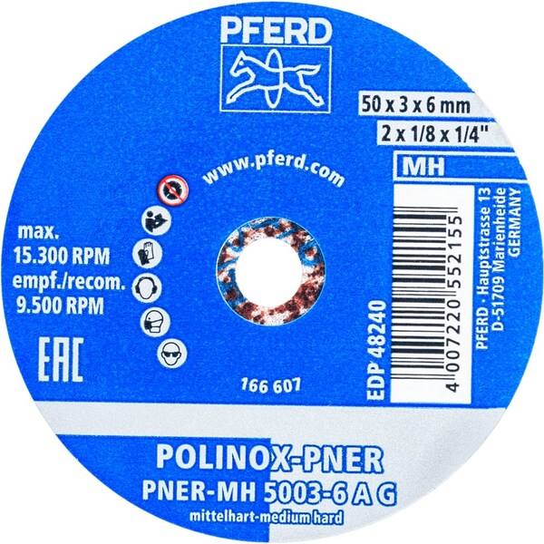 PFERD POLINOX Unitized Wheel, 2in x 1/8 x 1/4, Coarse, Medium-Hard, 6AC, Aluminum oxide