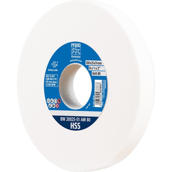 PFERD Vitrified Bench Wheel, HSS, 8in x 1 x 2, 80 Grit, Aluminum Oxide