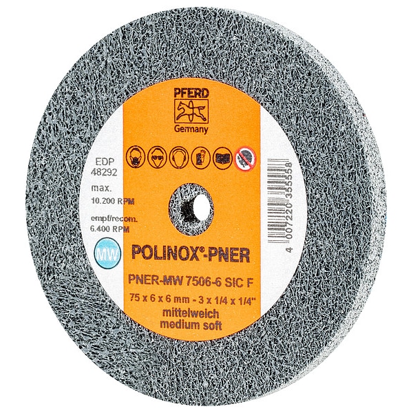 Unitized Wheel, Abrasive Material Silicon Carbide, Density Rating Medium/Soft (6), Grade Fine, Series PNER, Face Width 1/4 in, Maximum Operating Speed 10,200 RPM, Overall Diameter 3 in, Connector Size 1/4 in, Connector Type Unthreaded Hole, Color Gray