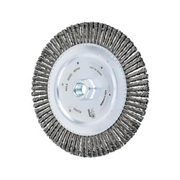 Pferd wheel brush 6-7/8 in brush dia, 3/16 in face width, 5/8-11 arbor hole size, stringer bead knot Filament/wire type, 0.02 in Filament/wire dia, carbon steel fill, 1-1/8 in trim length, 9,000 rpm maximum, threaded arbor attachment.