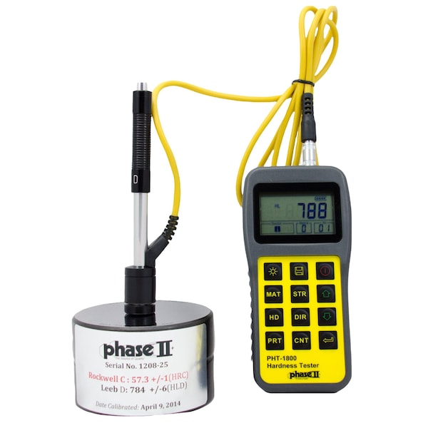 Loaded with the most popular features for hardness testing including memory and USB Output. Portable Hardness Tester specializing in testing large hard metal parts. Model No. PHT-1800. State of the art, digital portable hardness tester is designed to test the hardness of large hard metal parts. Loaded with useful functions only found on high priced models the PHT-1800 portable hardness tester is clearly setting a new industry standard by being the most accurate, economically priced portable hardness tester on the market today. Fast test speeds coupled with memory and output, this unit is a hands down winner whether you are out in the field or in the QC shop. The PHT-1800 portable hardness tester can perform tests that easily convert to the most popular hardness scales, including Rockwell, Brinell, Vickers, Shore, etc. Designed to test large hard parts: Example: Tool steel should be close to 1 thick of solid material. Model No. PHT-1800. State of the art, digital portable hardness tester is designed to test the hardness of large hard metal parts. Loaded with useful functions only found on high priced models the PHT-1800 portable hardness tester is clearly setting a new industry standard by being the most accurate, economically priced portable hardness tester on the market today. Fast test speeds coupled with memory and output, this unit is a hands down winner whether you are out in the field or in the QC shop. The PHT-1800 portable hardness tester can perform tests that easily convert to the most popular hardness scales, including Rockwell, Brinell, Vickers, Shore, etc. Designed to test large hard parts: Example: Tool steel should be close to 1 thick of solid material. Operation: Load the impact body. Place the impact body on your test piece. Push the button to begin testing and obtain reading. Standard Accessories: Base instrument. Impact device D. Calibrated test block. Custom carry case. Cleaning brush. Operation manual. Optional accessories: Impact devices; DC, D+15, DL, G, C. Special support rings. Functions: Easy to use keypad operation. Auto identification of Impact Device. Large LCD display with back light. USB Ouput.