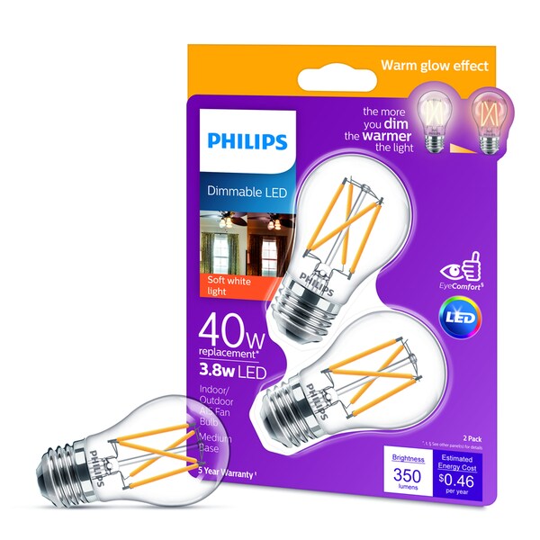 Unlike standard LEDs this Philips bulb offers a dimmable warm glow effect that lets you go from functional lighting to inviting to a cozy glow by dimming. Customize your room for every moment and always have the right light. Ideal for various decorative fixtures all around the house including table lamps wall sconces and ceiling fixtures as well as enclosed fixtures.