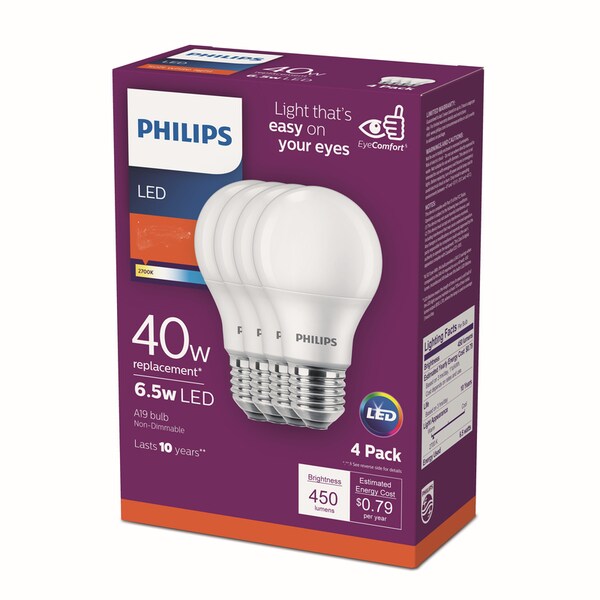 These Philips Soft White A19 bulbs provides similar light to a 40-Watt bulb at only 5.5-Watt. With a lifespan of 11 000 hours You will change your bulbs less frequently saving money and effort. Meets strict test criteria including flicker strobe and glare to achieve EyeComfort requirements.