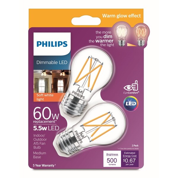 The more you dim the warmer the light with the Philips LED A15 clear glass bulb. Warm glow dimming technology gradually dims to warmer tones like traditional incandescent bulbs allowing you to relax and enjoy a light designed with your comfort in mind. Now you can customize your room for a variety of tasks with one light that lets you go from functional lighting to inviting to cozy just by dimming.
