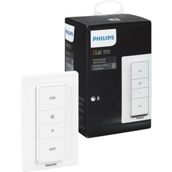 A battery-powered dimmer for the Philips Hue system that controls your preferred light setting. Works out of the box no wires on installation required. Connect up to 10 Hue lights to each dimmer switch.