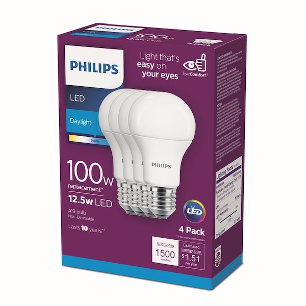 Philips LED A-shape light bulbs are a smart alternative to standard incandescent and designed to deliver everyday value and effective consistent light. This Philips 12.5-Watt LED A19 household light bulb is the perfect replacement for anywhere traditional light bulbs are used such as table or floor lamps. It provides a light similar to natural daylight perfect for your living room bedroom kitchen or any place in your home where you would use standard incandescent. This LED is an affordable replacement providing significant energy savings and replacing your current 100-Watt incandescent light bulb.