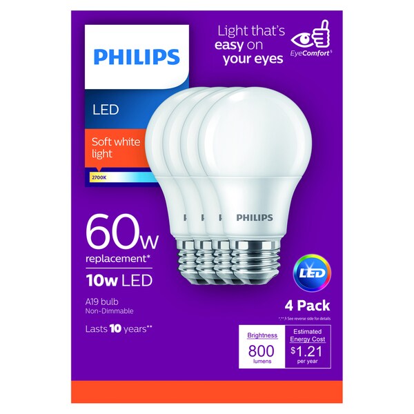 Philips LED A-shape light bulbs are a smart alternative to standard incandescent and designed to deliver everyday value and effective consistent light. This Philips 9-Watt LED A19 household light bulb is the perfect replacement for anywhere traditional light bulbs are used such as table or floor lamps. It provides a warm and comfortable light perfect for your living room bedroom kitchen or any place in your home where you would use a standard incandescent light bulb. The Philips household A19 LED is an affordable replacement providing significant energy savings while lighting your home with a warm soft white light.