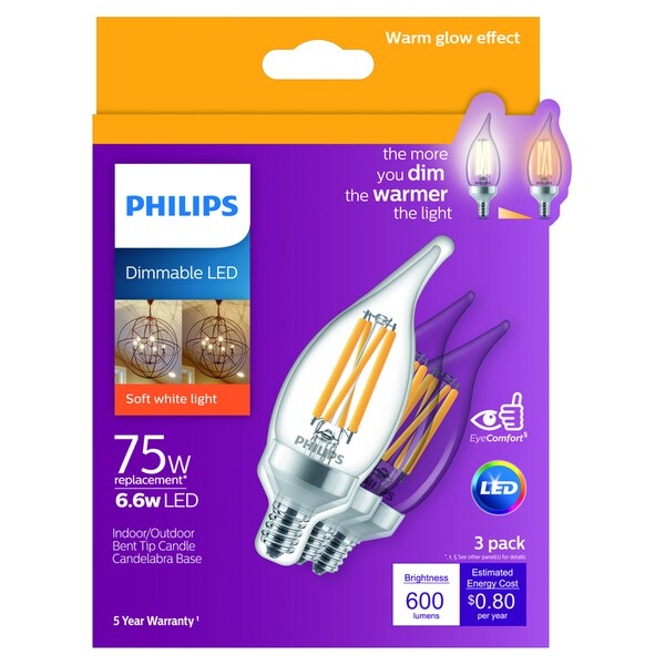 The look you love with the performance you expect. Philips 75-Watt Equivalent Dimmable Clear Glass LED BA11 light bulbs are a smart energy saving alternative to your standard incandescent with a classic glass design. This Philips 6.6-Watt LED BA11 bulb in natural daylight is the perfect replacement for anywhere traditional candle shaped bulbs with candelabra base are used such as chandeliers foyers recessed coves and bedrooms. The classic glass design with exposed filament offers a nostalgic warm appearance.