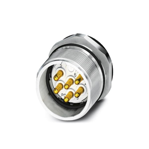 Device connector front mounting CA straight shielded: yes for standard and SPEEDCON interlock M23 No. of pos.: 8+1 type of contact: Pin Solder connection Axial seal Central fastening M20 x 1.5 coding:N