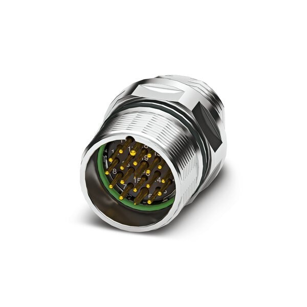 Device connector front mounting CA straight shielded: yes for standard and SPEEDCON interlock M23 No. of pos.: 16+2+PE type of contact: Pin Crimp connection Axial seal Central fastening M20 x 1.5 can be positioned via a locking nut coding:N
