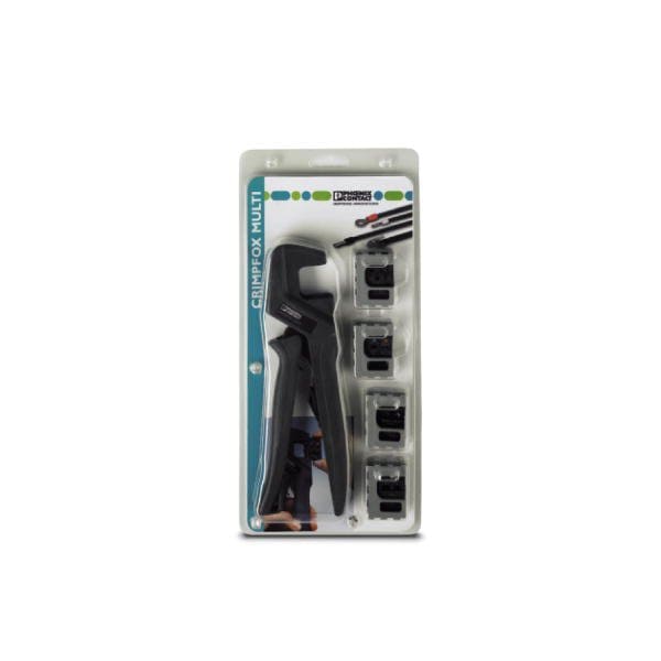 Crimping pliers set consisting of CRIMPFOX-M pliers and dies for insulated cable lugs 0.5 ... 2.5 mm 1212074 non-insulated conduit lugs 0.5 ... 6 mm 1212079 and ferrules 0.25 ... 10 mm 1212080 and 16/25 mm 1212081.