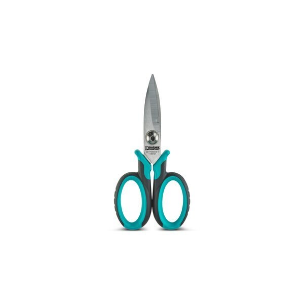 Electrician's scissors high cutting performance due to micro-serrated cutting area notch for removing the sheath from multi-stranded cables suitable for copper aluminum Kevlar fibers and plastic two-component non-slip soft-grip handles ergonomic design adjustable screw