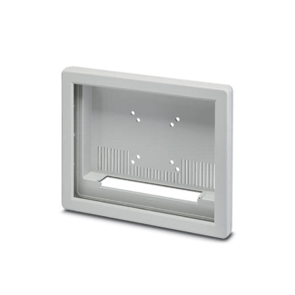 Display housing 15 light gray central window front level with ventilation slots cutout for connection technology angle plate and VESA mount consisting of two half shells with screws