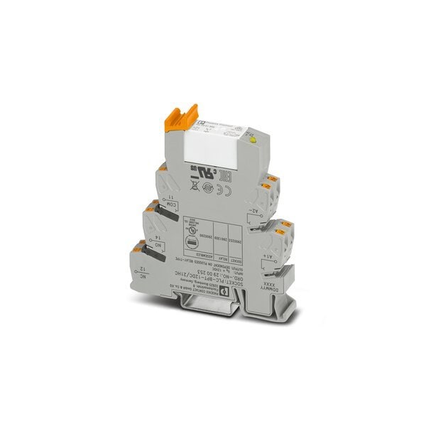 PLC-INTERFACE for high continuous currents consisting of PLC-BPT.../21 HC basic terminal block with push-in connection and plug-in miniature relay for mounting on DIN rail NS 35/7 5 limiting continuous current up to 10 A 1 PDT input voltage 12 V DC