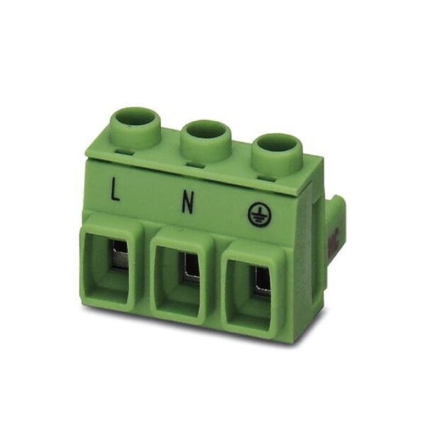 Plug component Nominal current: 16 A Rated voltage III/2: 400 V Number of positions: 3 Pitch: 7.62 mm Connection method: Screw connection with tension sleeve Color: green Contact surface: Tin