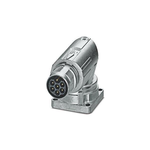 Device connector front mounting angled rotatable for standard and ONECLICK fast locking system M17 No. of pos.: 6+PE type of contact: Pin Crimp connection flange dimensions: 26 mm x 26 mm coding:N