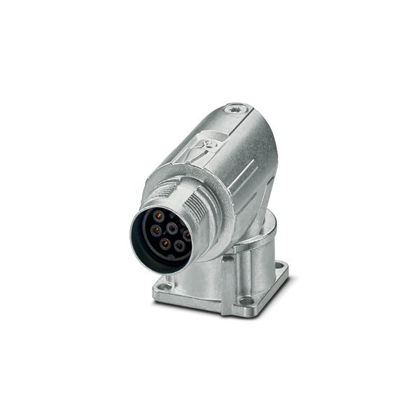 Device connector front mounting angled rotatable for standard and ONECLICK fast locking system M17 No. of pos.: 7+PE type of contact: Socket Crimp connection flange dimensions: 26 mm x 26 mm coding:N