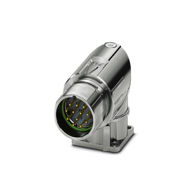 Device connector front mounting M23 PRO angled rotatable for standard and ONECLICK fast locking system M23 No. of pos.: 12 type of contact: Pin Crimp connection flange dimensions: 26 mm x 26 mm coding:N