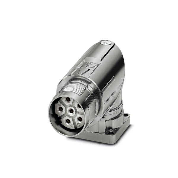 Device connector front mounting M23 PRO angled rotatable for standard and ONECLICK fast locking system M23 No. of pos.: 5+PE type of contact: Socket Crimp connection flange dimensions: 26 mm x 26 mm