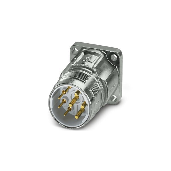 Device connector front mounting M23 PRO straight for standard and ONECLICK fast locking system M23 No. of pos.: 4+3+PE type of contact: Pin Crimp connection 4x 3.2 flange dimensions: 26 mm x 26 mm