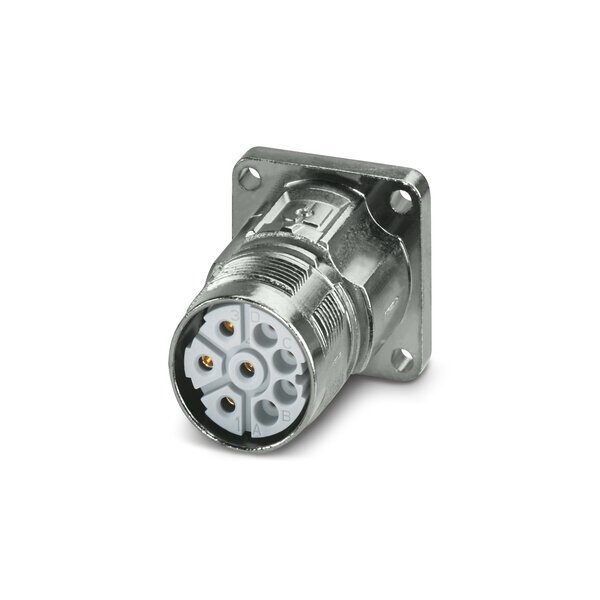 Device connector front mounting M23 PRO straight for standard and ONECLICK fast locking system M23 No. of pos.: 4+3+PE type of contact: Socket Crimp connection 4x 3.2 flange dimensions: 28 mm x 28 mm