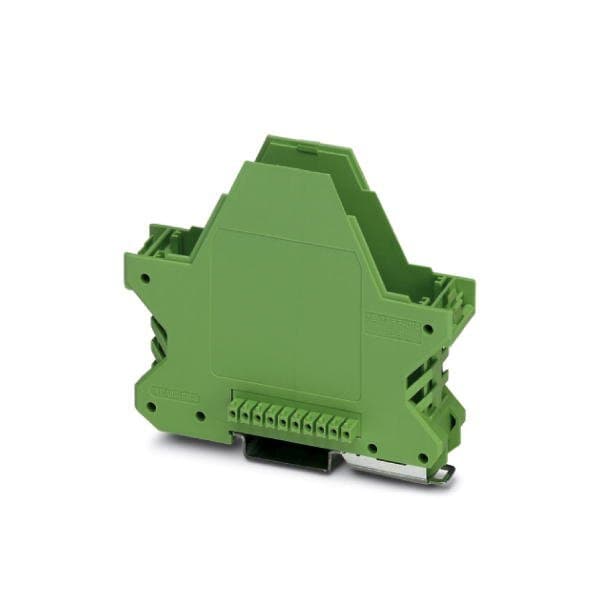 DIN rail housing Lower housing part with metal foot catch flat design with vents width: 22.6 mm height: 99 mm depth: 84.8 mm color: green 6021 cross connection: integrated bus connector number of positions cross connector: 10 Bus connector: 10 parallel contacts