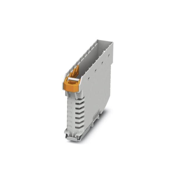 DIN rail housing Lower housing part with metal foot catch with functional ground contact with 3U Lock and Release system with vents width: 18.9 mm height: 109.6 mm depth: 64.3 mm color: light gray 7035 cross connection: DIN rail connector optional number of
