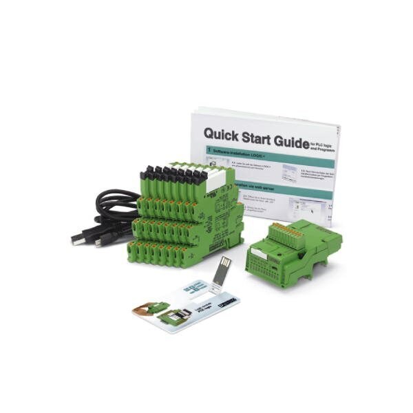 PLC logic starter kit 1 consists of: plug-in basic logic module eight relay output terminal blocks 250 V AC/DC max. 6 A micro USB programming cable LOGIC+ software PLC logic quick start guide poster push-in connection