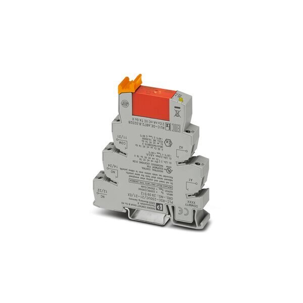 PLC-INTERFACE consisting of DIN-rail-mountable basic terminal block in 14 mm with screw connection and plug-in relay with power contact 2 changeover contacts 230 V AC/220 V DC input voltage. Approved according to ATEX/IECEx Zone 2 and Ex Zone Class I Div. 2.
