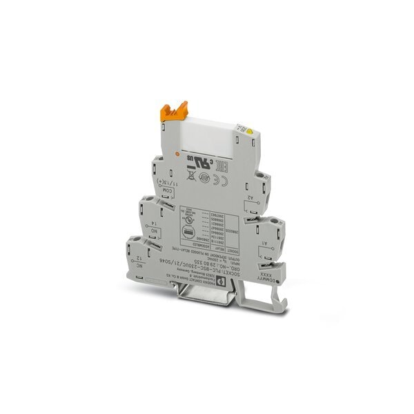 PLC-INTERFACE with interference current and interference voltage protection on the control side consisting of PLC-BSC.../21 basic terminal block with screw connection and plug-in miniature relay with power contact 1 PDT input voltage 230 V AC